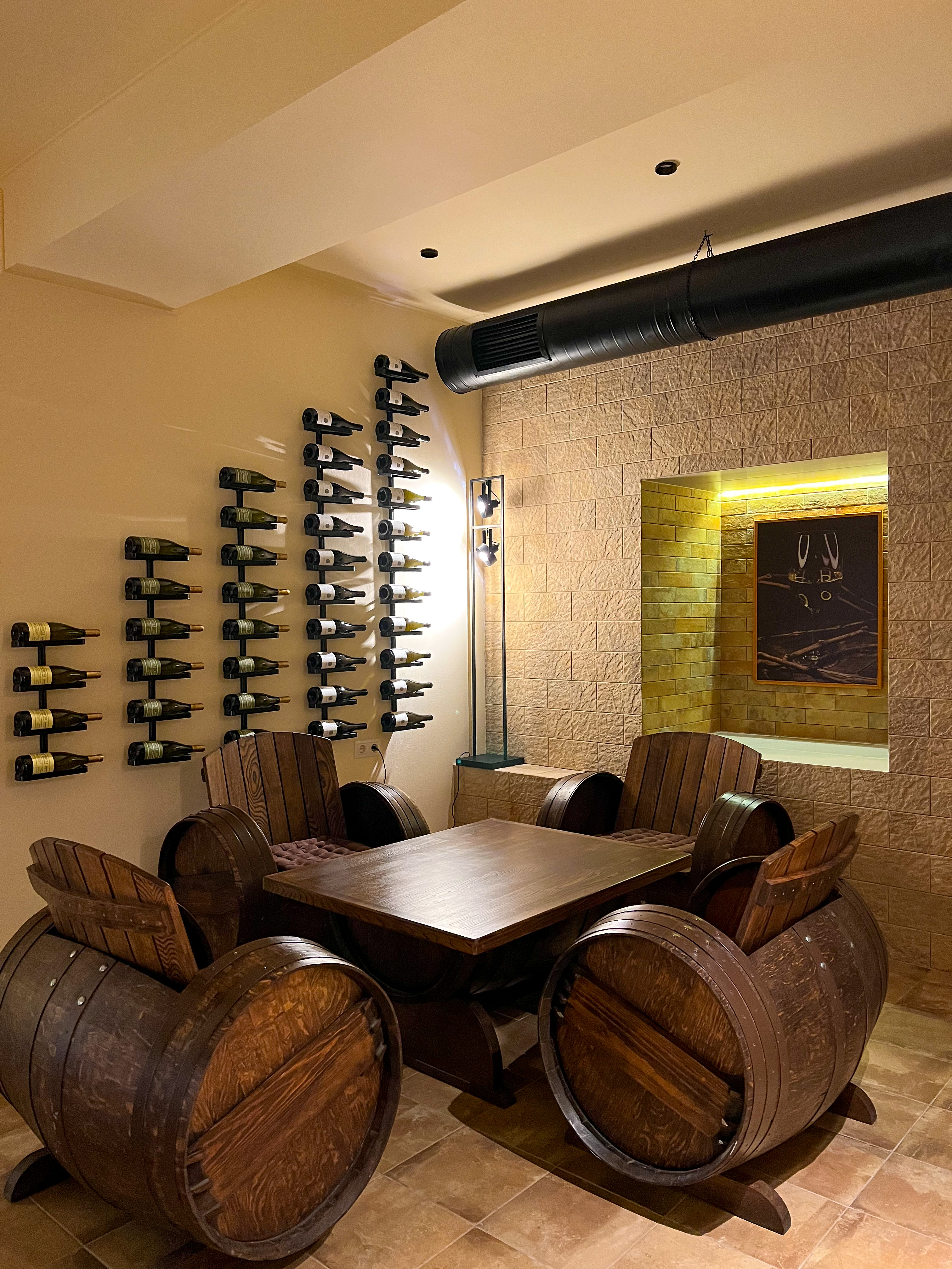 Here is a quiet atmosphere where old wine barrels from the Dakishvili cellar have found a new life, repurposed as tables and armchairs for local wine lovers.